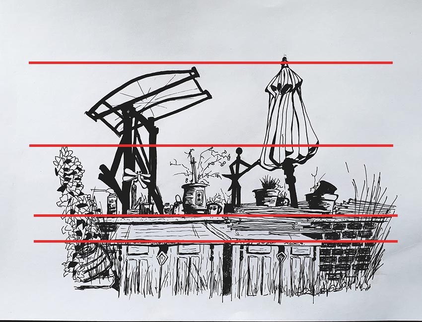 You might argue, oh it’s just a sketch. But, thanks to the technical polish, it is better than that. Even in basic sketching I think we should be making compositional decisions right from the start: select a focus, decide on a hierarchy of shapes, and see how lines – especially diagonals – can lead the eye around the picture, and create rhythm.